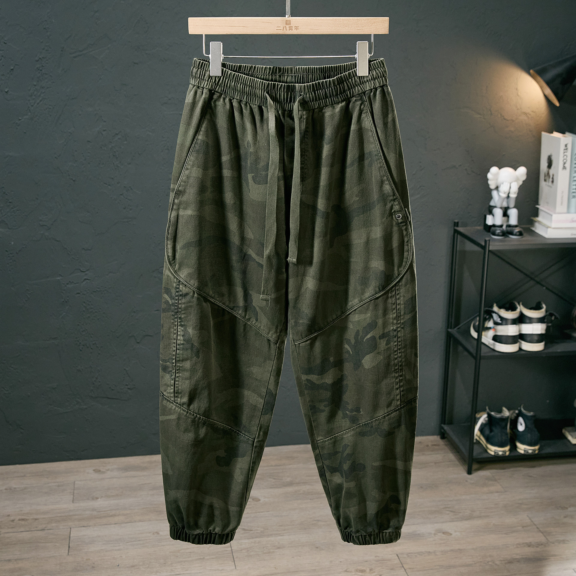 纯棉复古迷彩休闲裤男宽松哈伦束脚裤子拼接舒适松紧腰户外工装裤