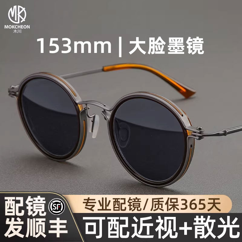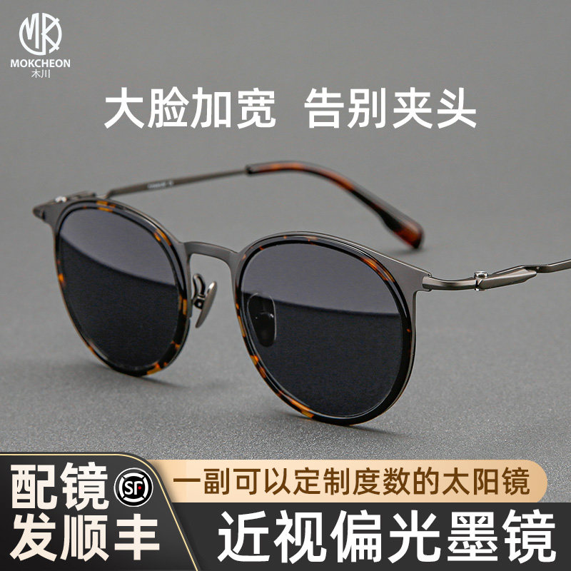 木川155MM大脸近视墨镜男款复古圆框加宽钛架可配度数偏光太阳镜