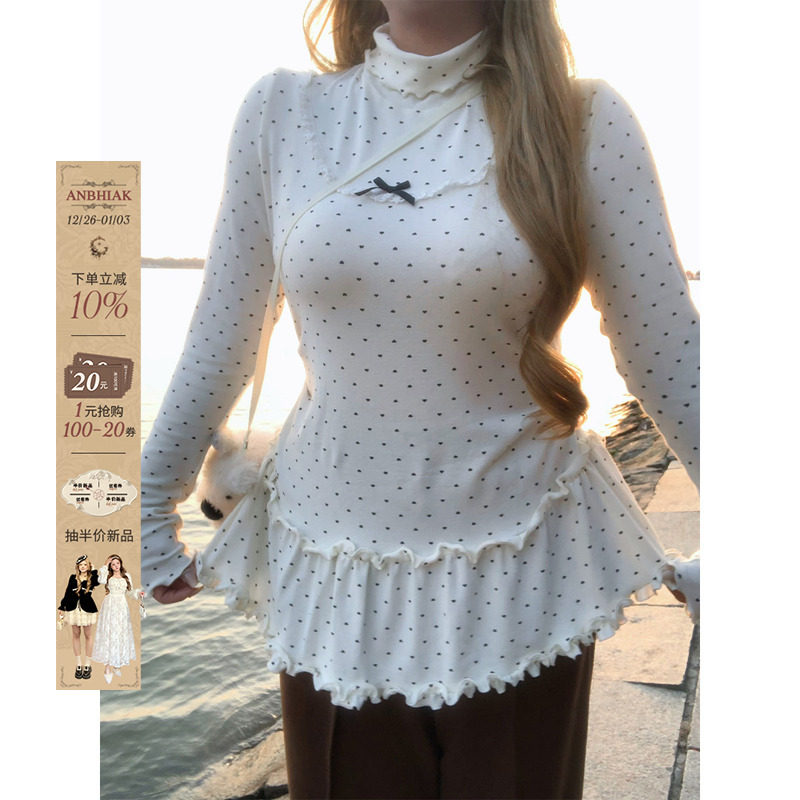 安妮不火 甜美系波点印花蕾丝花边针织衫女微胖大码可爱长袖上衣