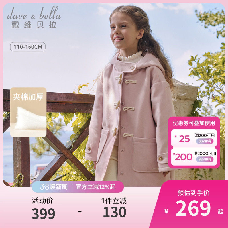 戴维贝拉儿童连帽毛呢外套2026女童新款中长款夹棉大衣中大童冬装
