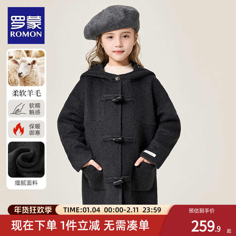 罗蒙女童双面羊毛大衣中长款秋冬装全羊毛呢外套呢子韩版连帽洋气
