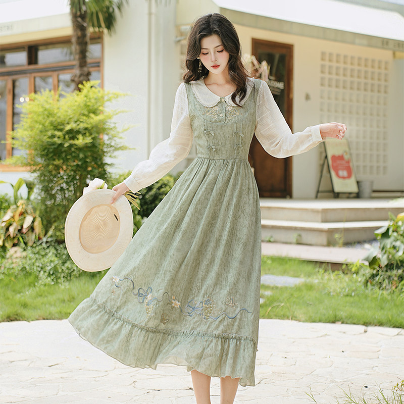 苏浅春秋欧式复古宫廷文艺棉麻高腰连衣裙收腰显瘦马甲田园两件套