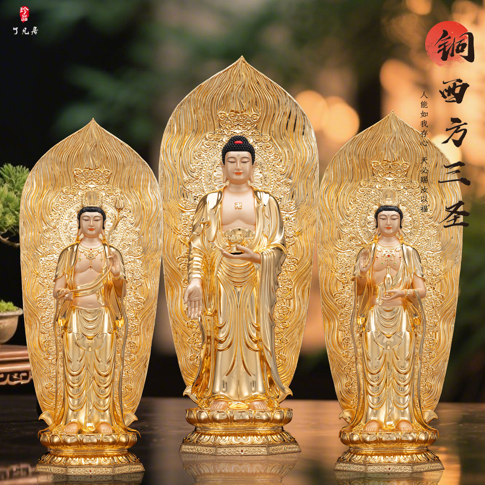 西方三圣铜像家用供奉台湾站鎏金阿弥陀佛观音大势至菩萨祝福摆件