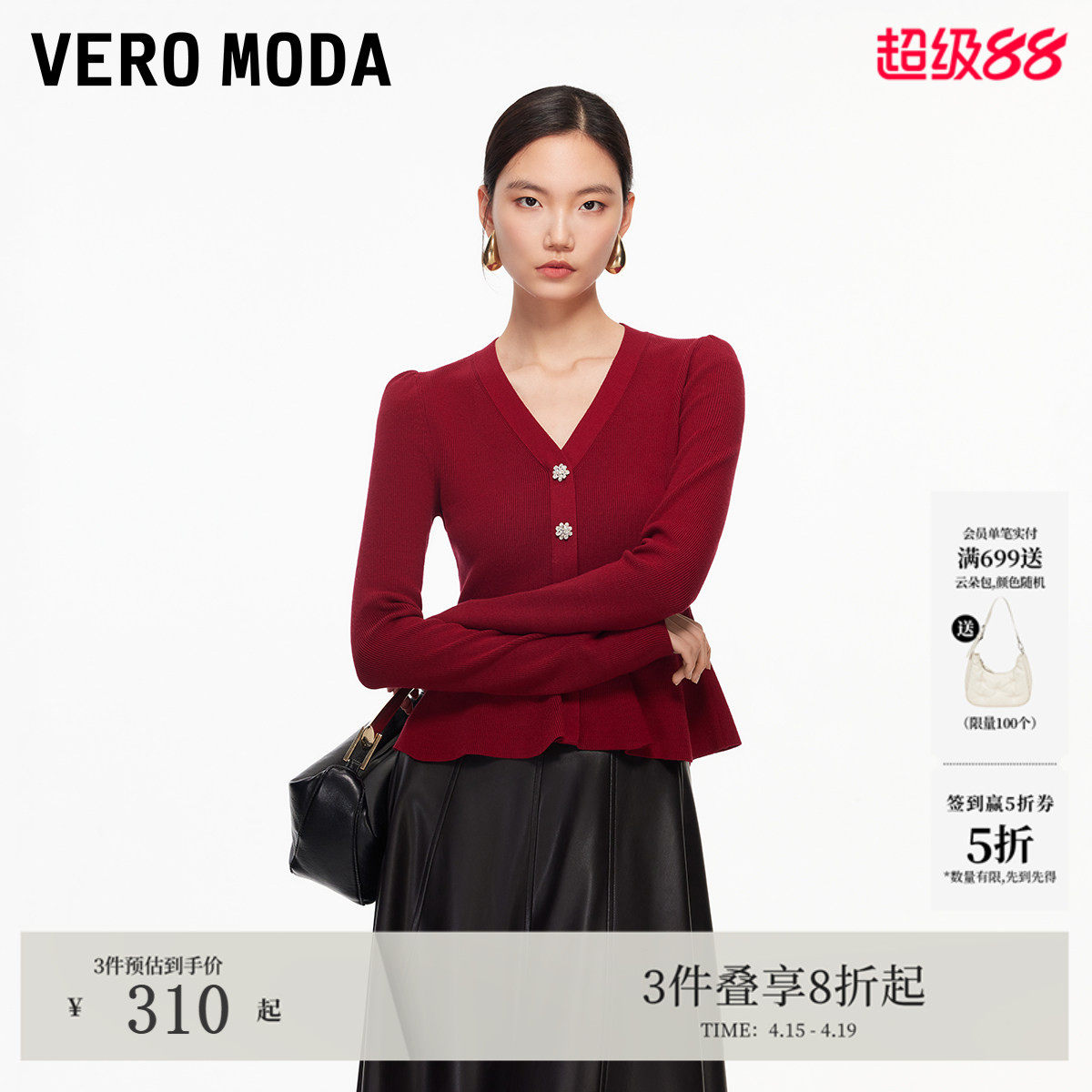 Vero Moda针织衫女2026春季新款荷叶边收腰修身红色毛衣法式优雅