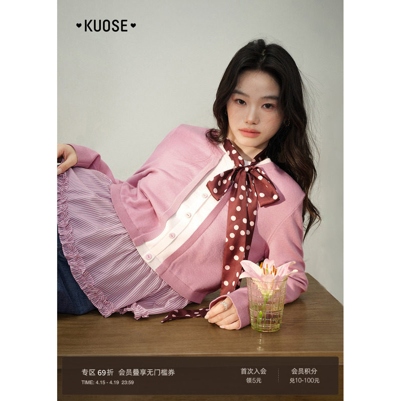 阔色假两件木耳边条纹衬衫拼接毛衣女装2026春季新款粉色针织衫秋