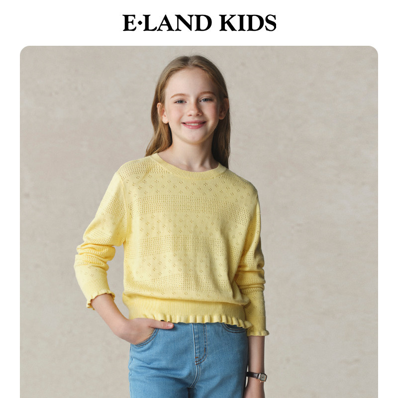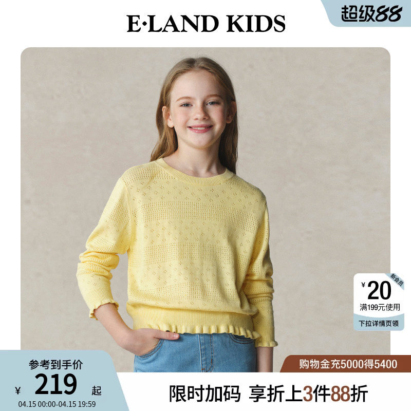 eland kids衣恋童装女童毛衣春秋休闲复古甜美木耳边镂空针织衫
