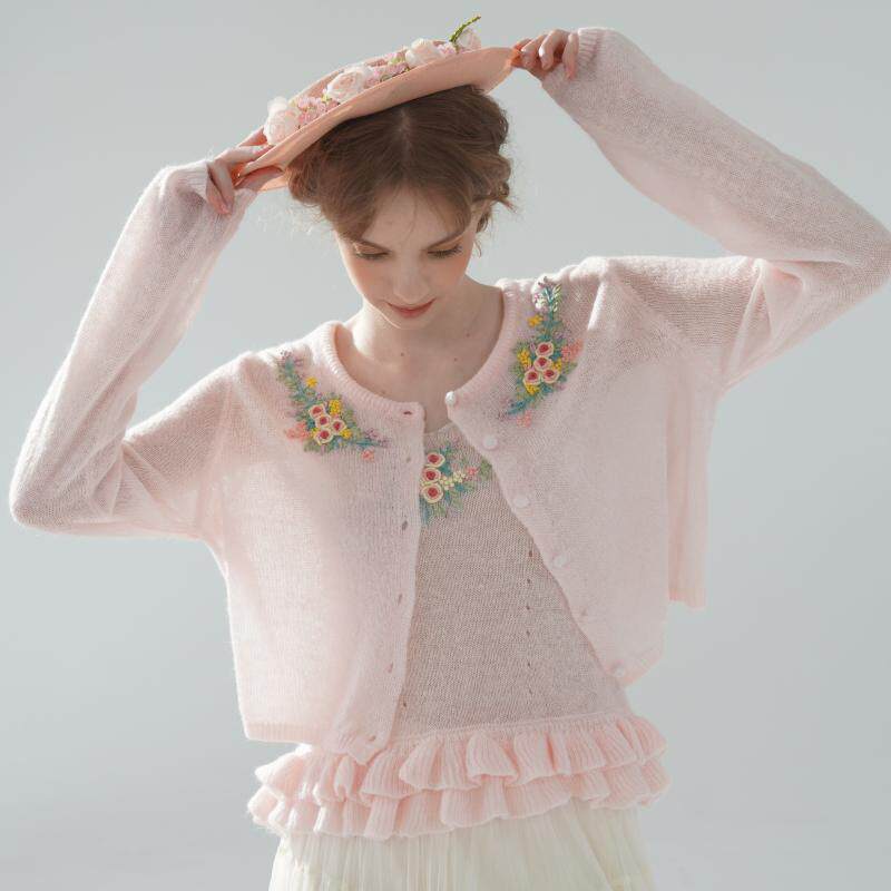 脸儿艺 原创手工绣花法式立体小玫瑰朵木耳边吊带+开衫毛衣两件套