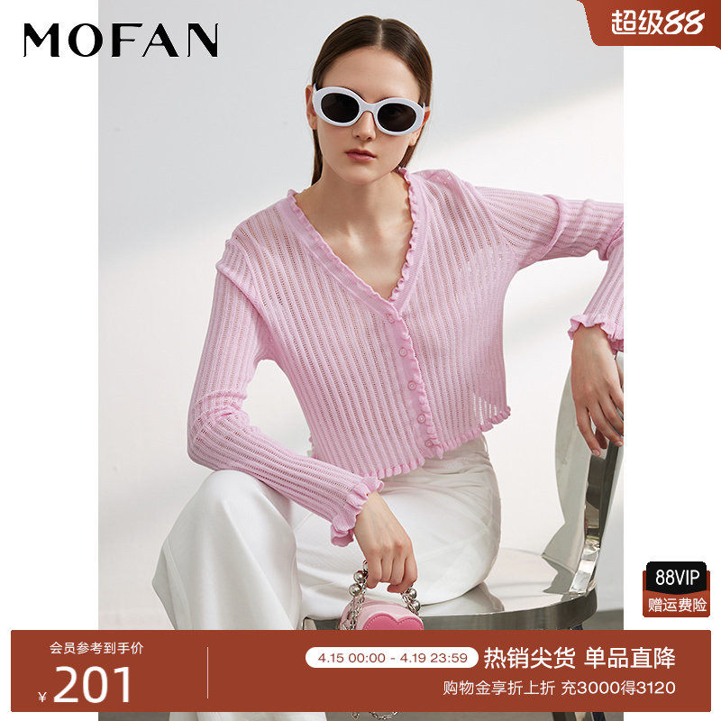 木耳边镂空针织开衫女MOFAN摩凡夏装新款粉色V领修身毛衫显瘦