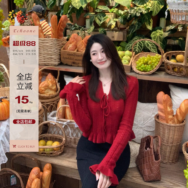 Echoone Fairy tale 羊毛钩花毛衣女设计感绑带小性感木耳边上衣