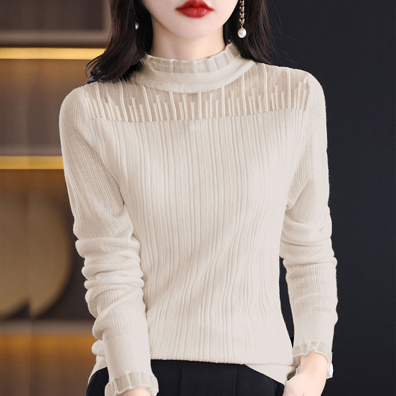鄂尔多斯市羊毛衫女2025春季新款木耳领蕾丝边薄款长袖针织打底衫
