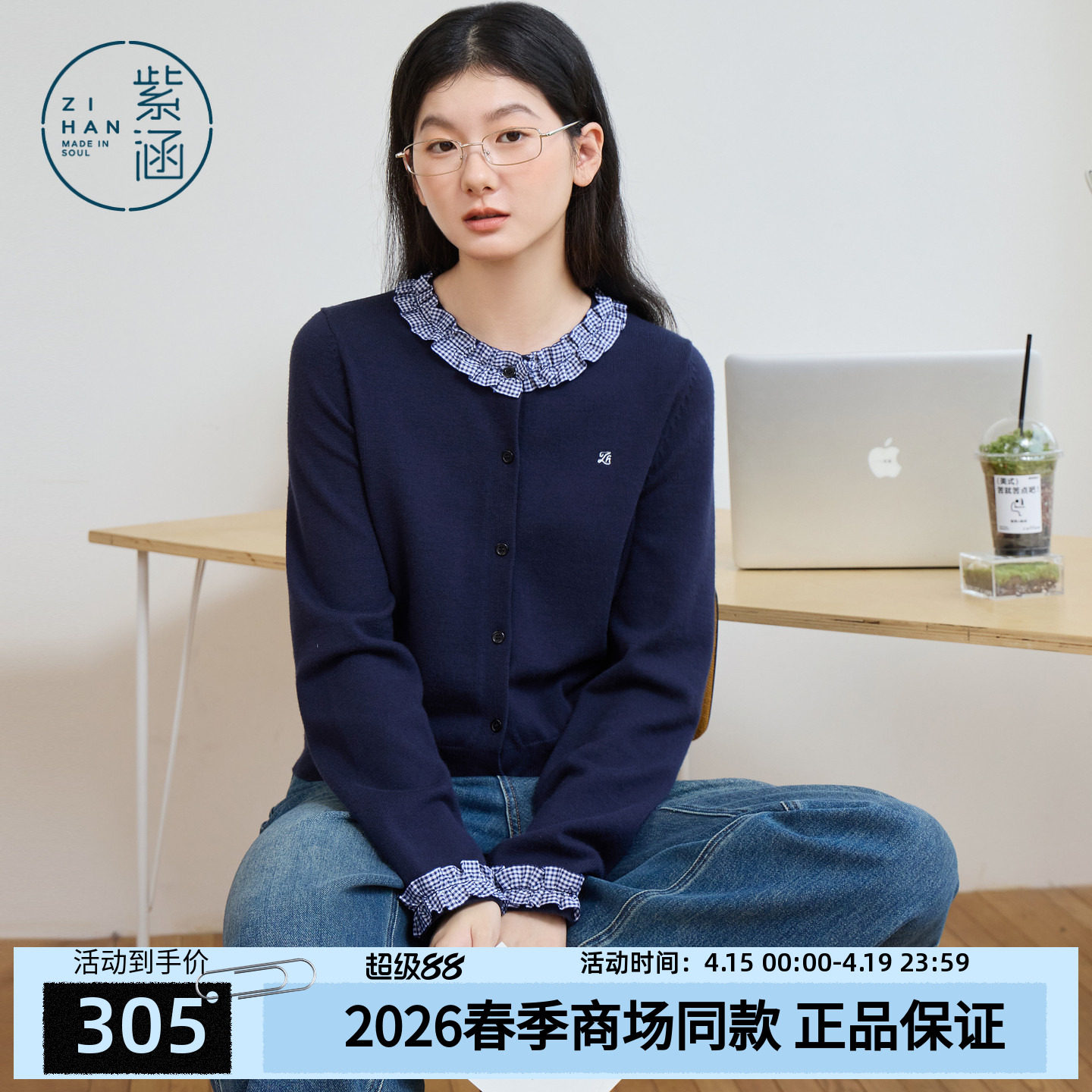 紫涵撞色格纹木耳花边针织开衫女2026年春季新款韩系宽松圆领毛衫