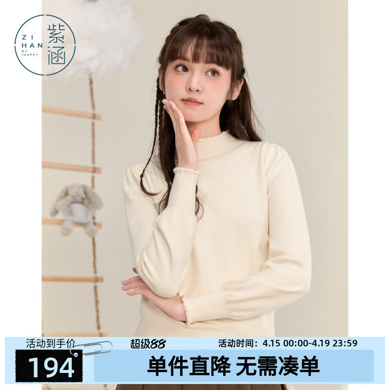 紫涵半高领内搭打底衫女士冬季新款木耳花边百搭针织衫保暖毛衣潮