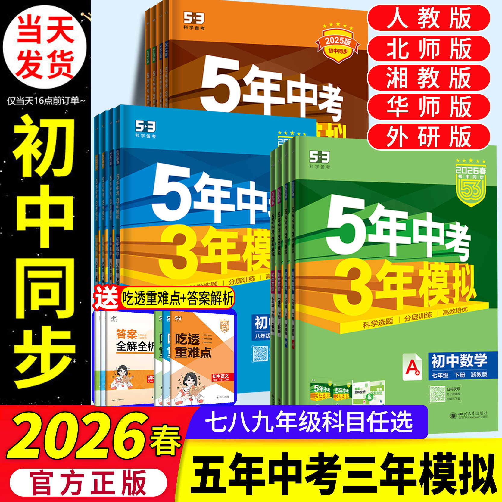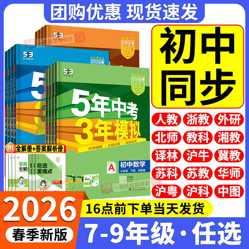 2026春五年中考三年模拟七年级下册八九年级上册数学语文英语科学物理生物历史人教北师外研版5年3年模拟初一二三同步练习册必刷题
