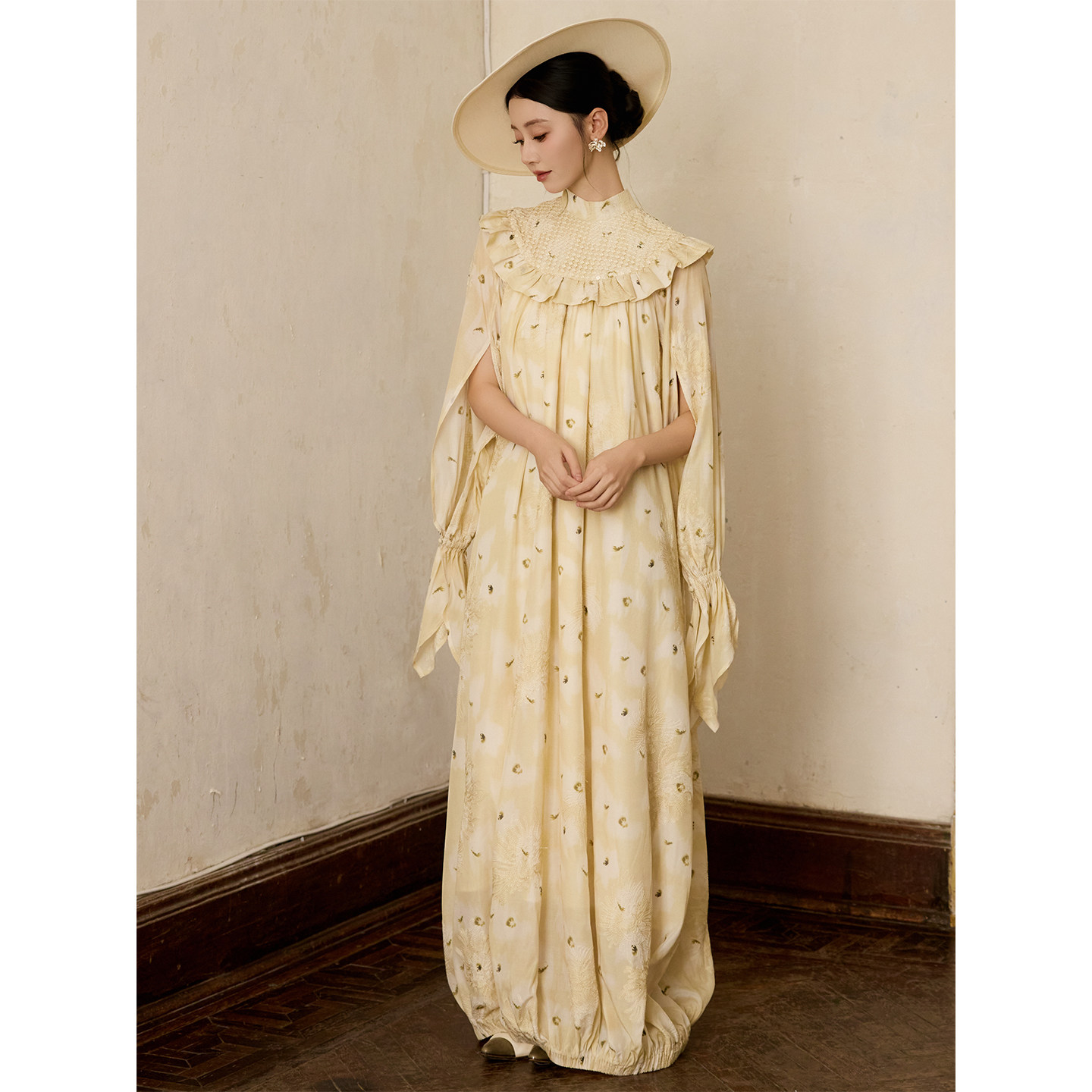浒城古娘新款重工刺绣气质毛领长款新中式国风战袍连衣裙女款秋冬