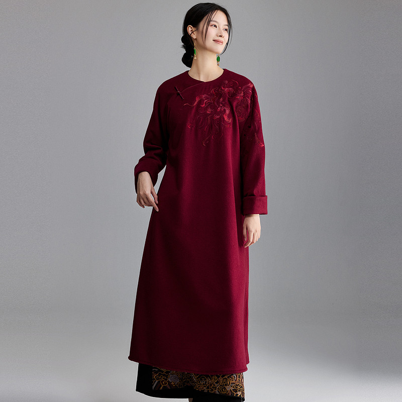 陌遇国风秋冬新款 羊毛呢重工绣花红色宽松旗袍 新中式复古连衣裙