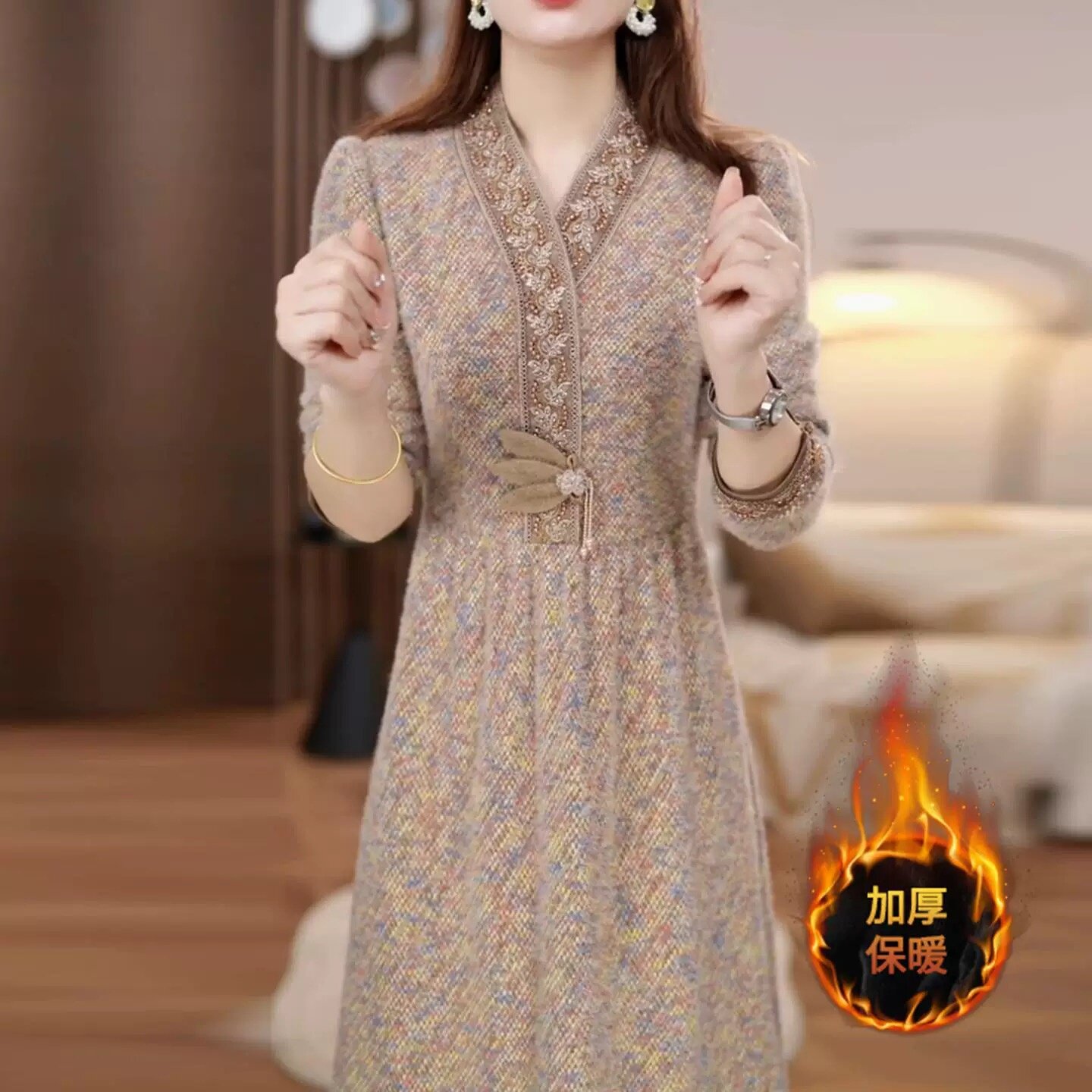 高端重工刺绣丝绒连衣裙2025秋冬气质中老年妈妈旗袍宽松打底长裙