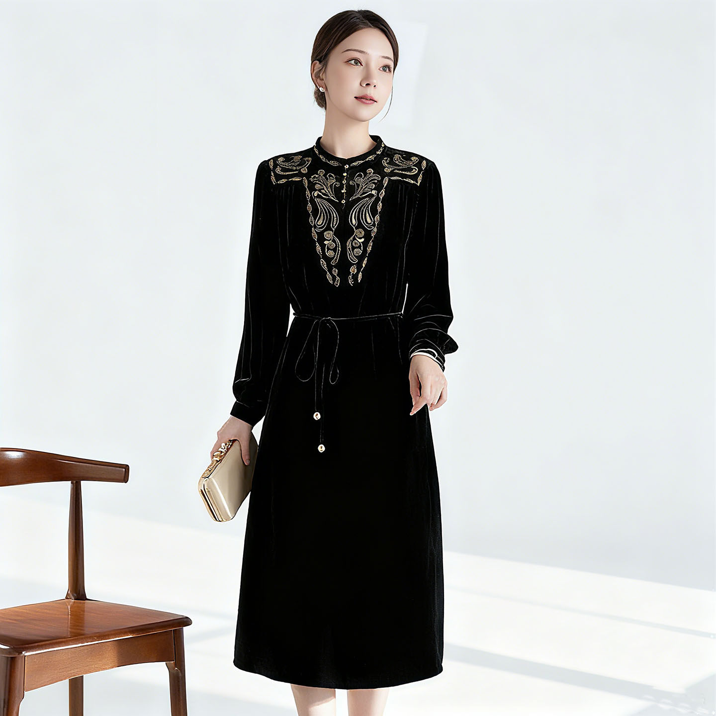 水墨佳人秋冬重工刺绣真丝丝绒连衣裙女高级感桑蚕丝纯色优雅礼服