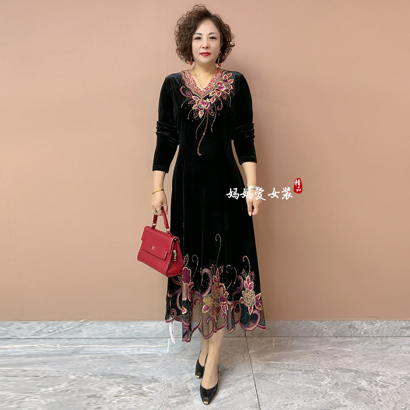 重工刺绣气质妈妈连衣裙2025秋冬新款丝绒拼接醋酸宽松大码长裙子