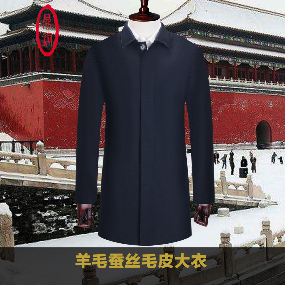 鼎铜羊毛风衣男桑蚕丝中长款中年男士秋冬季商务休闲翻领宽松外套