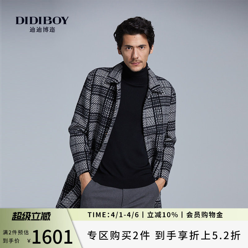 DIDIBOY迪迪博迩冬季中长款翻领格子中年男士保暖羊毛大衣外套