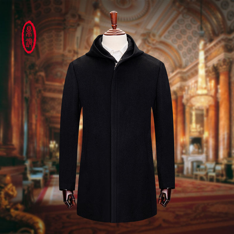 鼎铜男士连帽羊毛大衣中长款冬季黑色保暖商务毛呢外套中年高端新