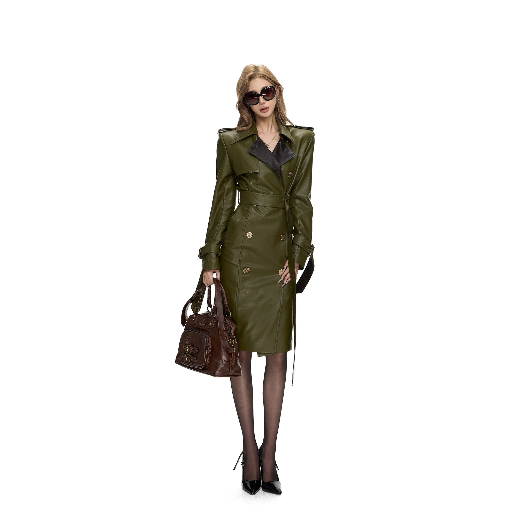 Fanptntox·军阀贵女·橄榄拼接长款金扣外套包臀修身皮风衣