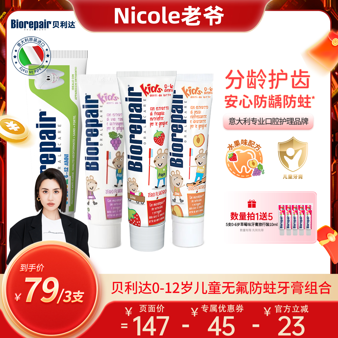 【Nicole老爷推荐】贝利达进口儿童牙膏无氟健齿水果味防蛀护齿
