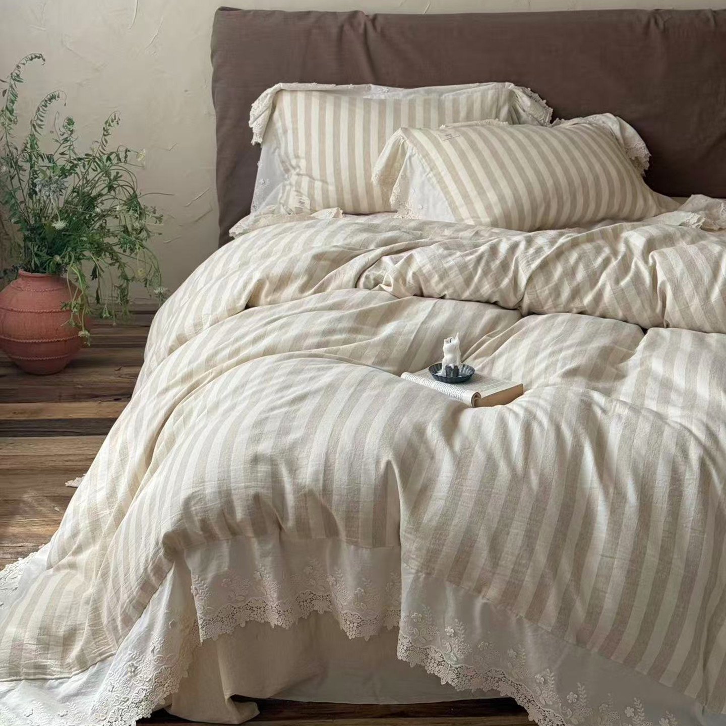 南法假日长绒棉亚麻中古宽边棉麻四件套全棉纯棉床上用品床单被套
