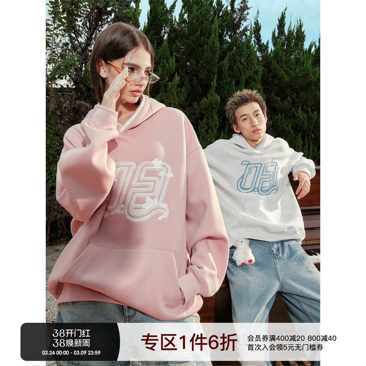 FORNINES重磅毛巾绣连帽卫衣男女国潮加绒情侣装帽衫加厚套头外套