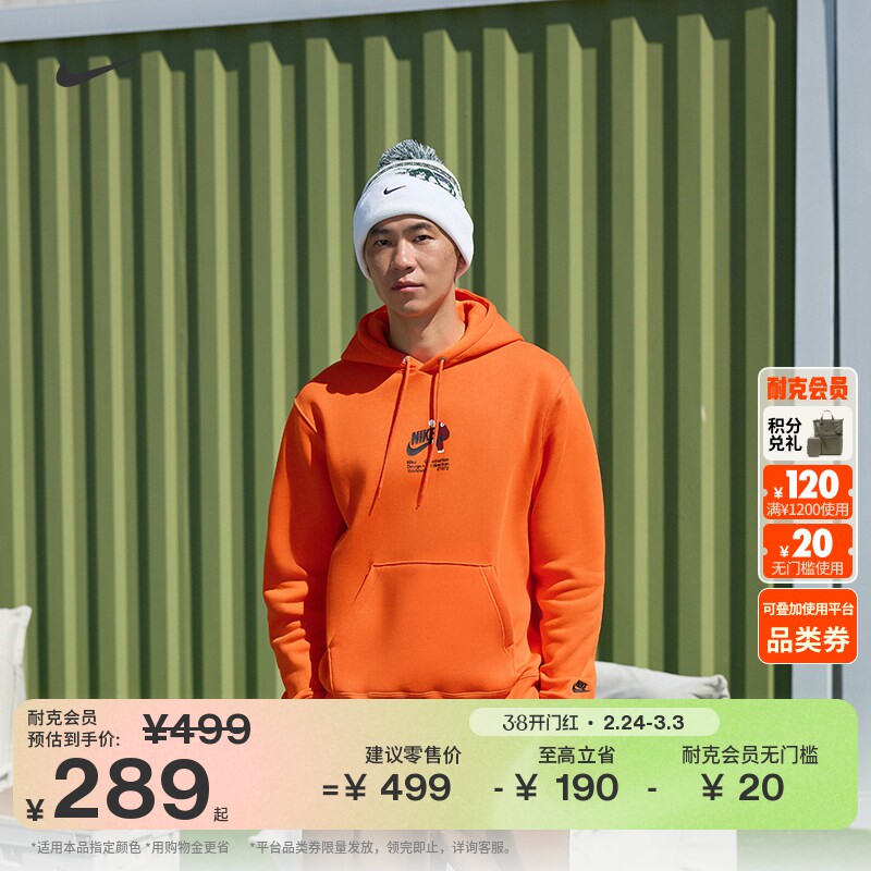 NIKE耐克男子加绒套头连帽衫秋冬新款针织休闲刺绣卫衣FN3860-499