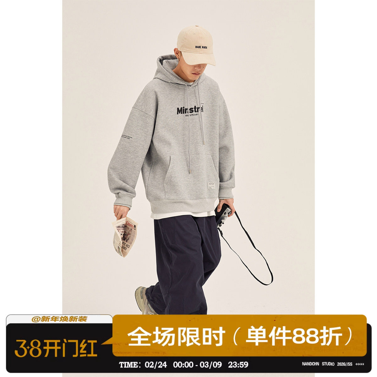 男道秋冬新款小字母重磅连帽薄款卫衣男美式复古加绒灰色套头帽衫