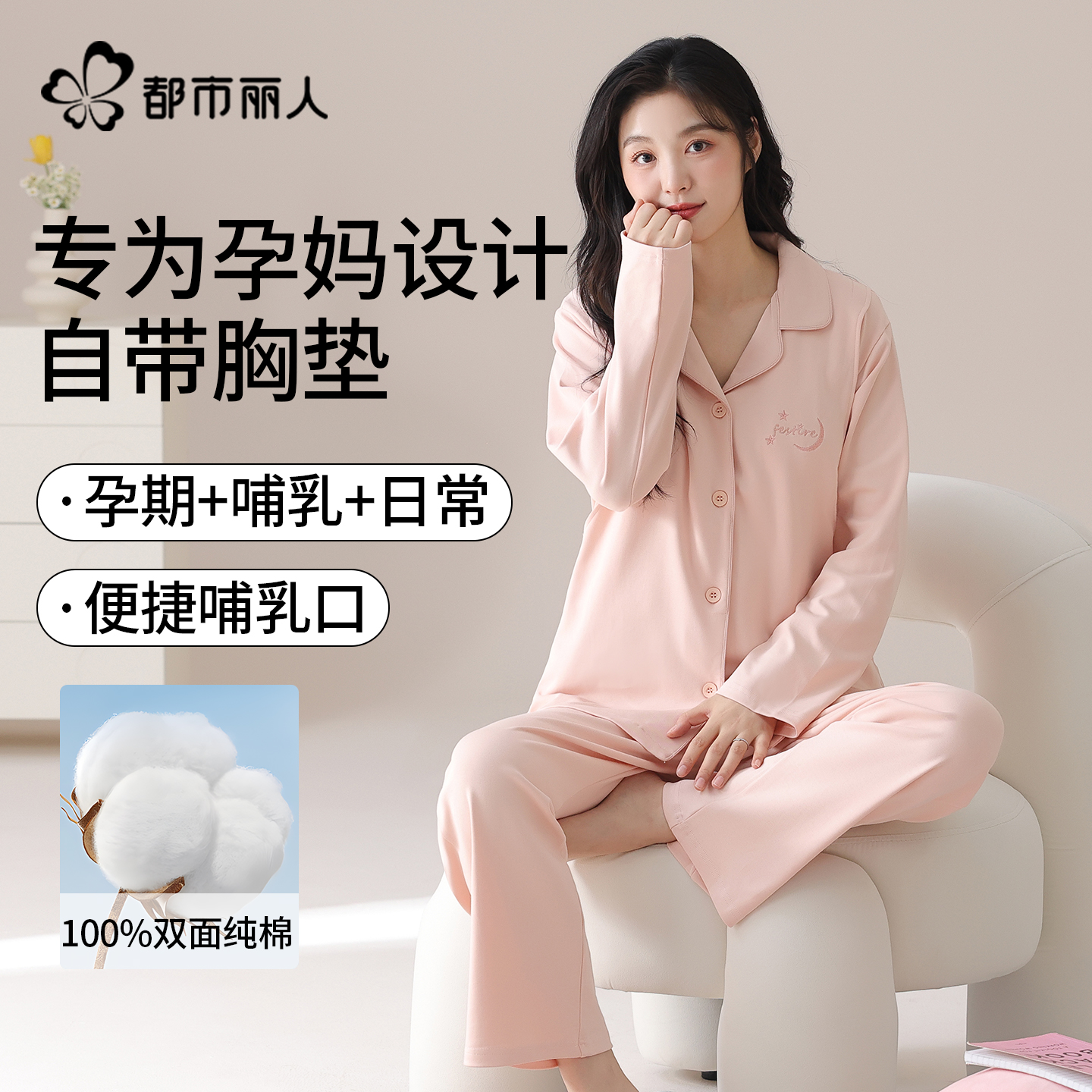 都市丽人纯棉月子服带胸垫2025新款抑菌防螨秋季睡衣孕妇产后哺乳