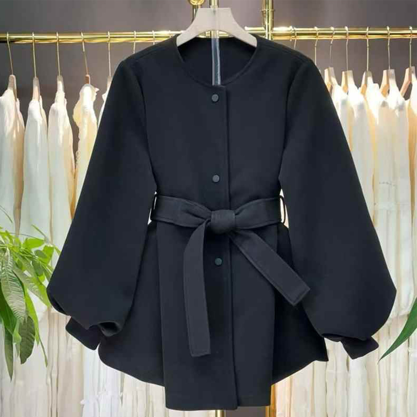 高级感黑色呢子外套女2026新款灯笼袖系带宽松显瘦中长气质上衣