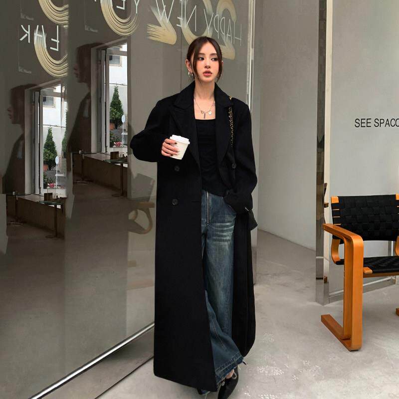 韩系复古黑色双排扣毛呢外套女小个子中长款西装领呢子大衣高级感