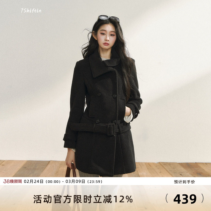 7Shiftin 原创黑色毛呢外套秋冬款双排扣高级可拆卸下摆呢子大衣
