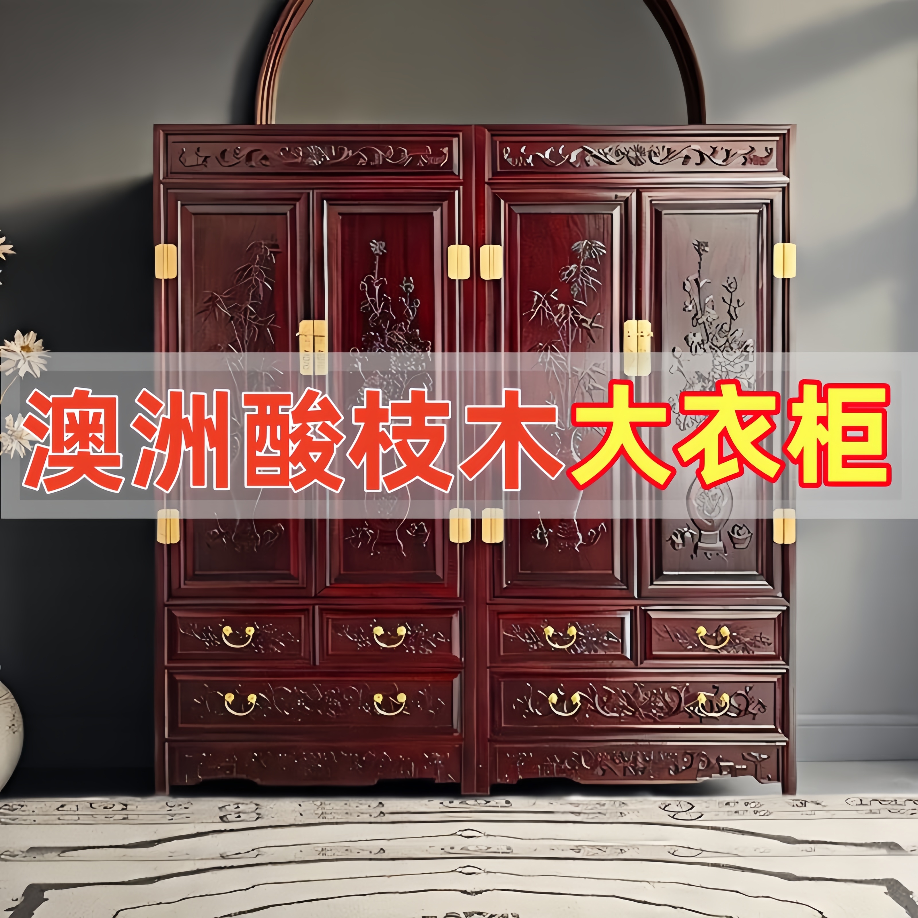 澳洲酸枝木新中式实木2门顶箱柜雕花大衣柜4门仿古卧室储物衣帽柜
