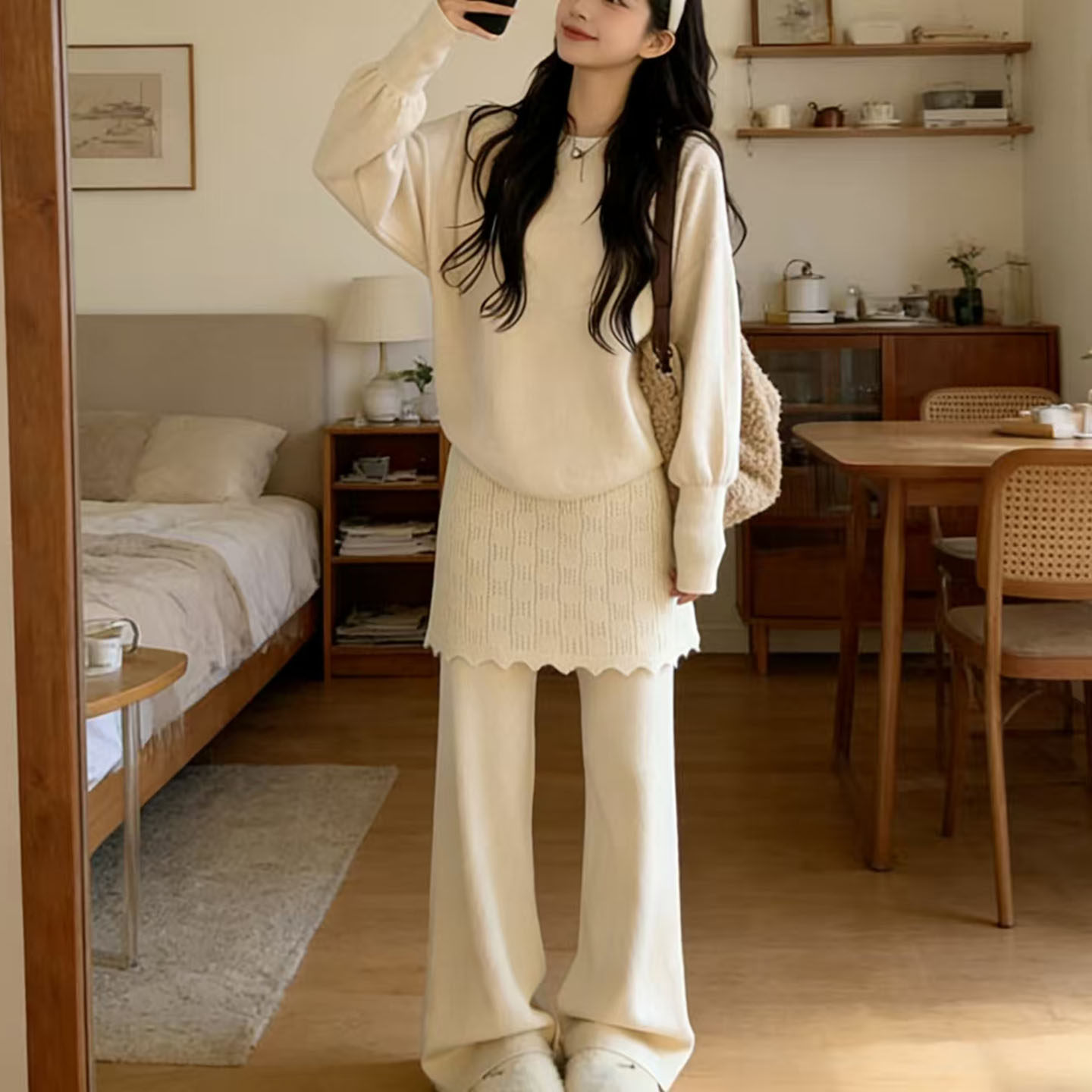 韩系温柔风一字领针织套装女秋冬新款遮屁帘休闲阔腿裤毛衣两件套