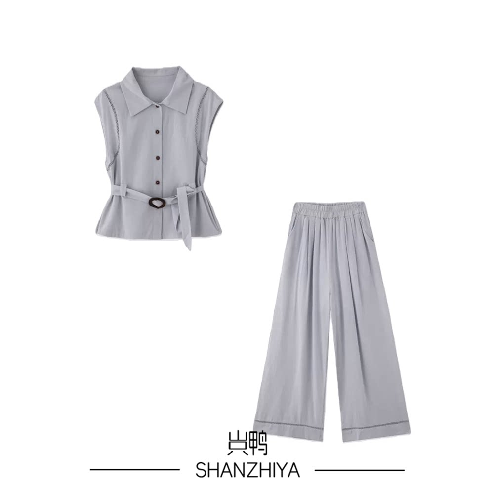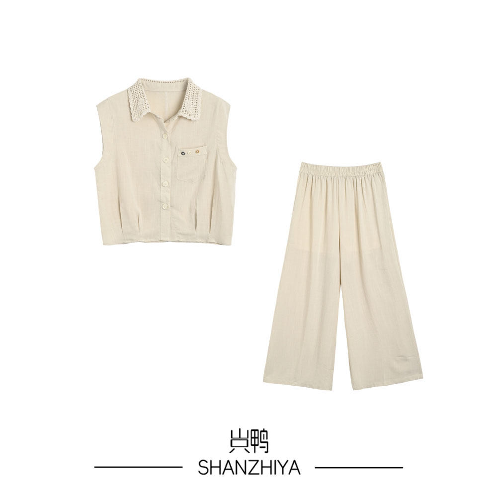 山只鸭/SZY 蕾丝翻领收腰马甲阔腿裤两件套女松弛感显瘦套装