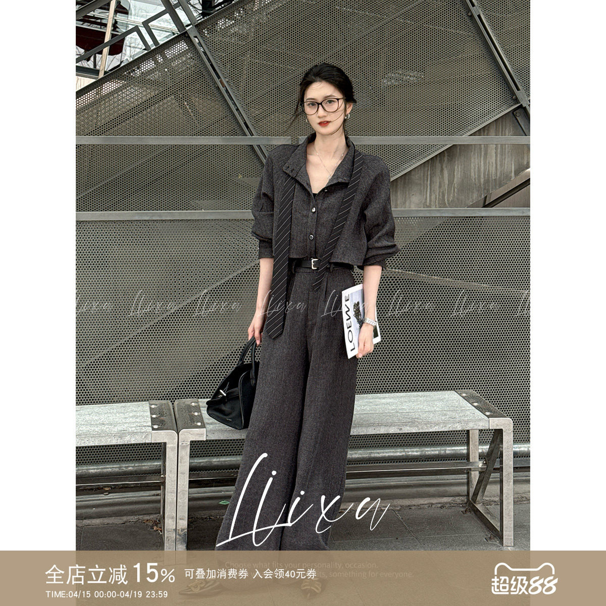 Liixu 春季新款时尚休闲设计感小众灰色拼接上衣高腰阔腿裤两件套