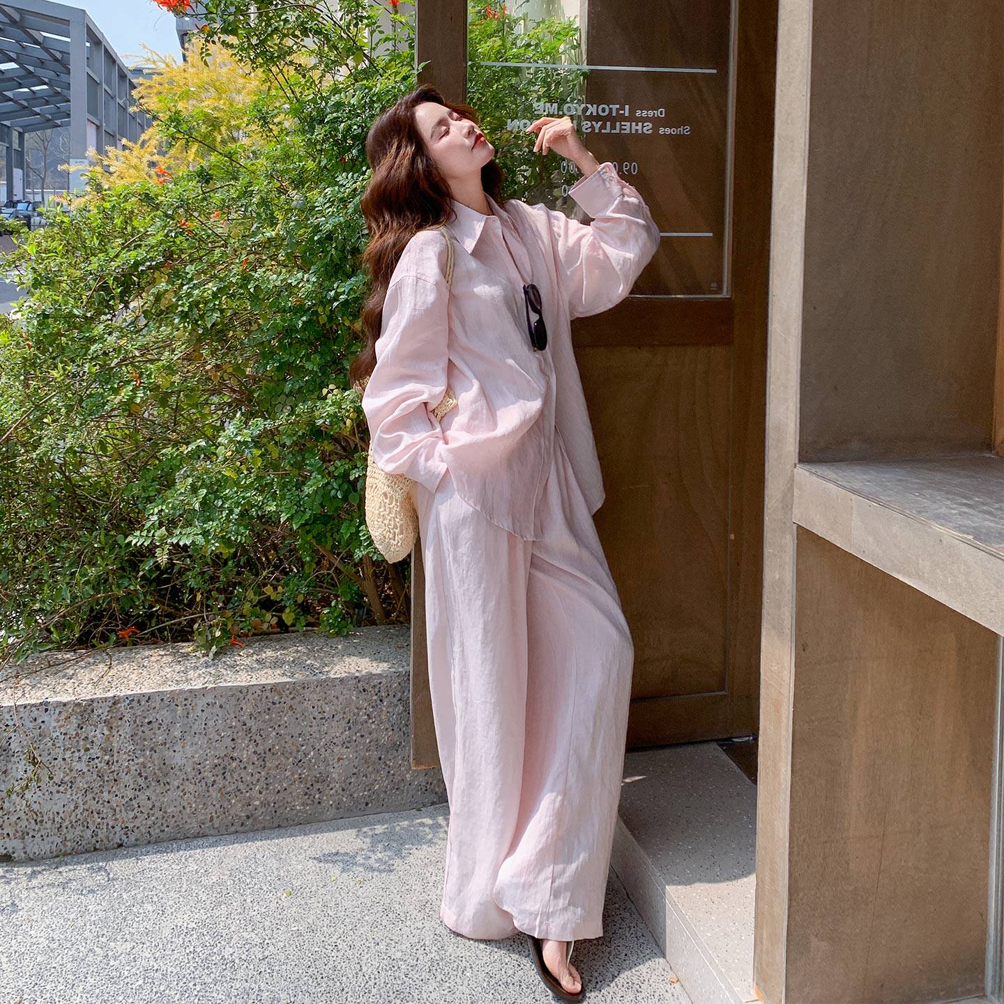 粉色休闲时尚套装女夏2026新款今年流行轻薄长袖衬衫阔腿裤两件套
