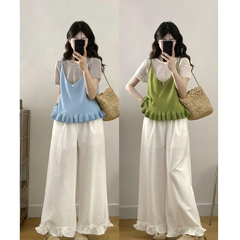 MM谢谢家大码女装夏温柔减龄叠穿针织吊带两件套+木耳花边阔腿裤