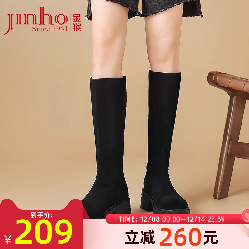 金猴女鞋长靴小个子骑士靴2025年新款冬季厚底加绒高跟女靴长筒靴