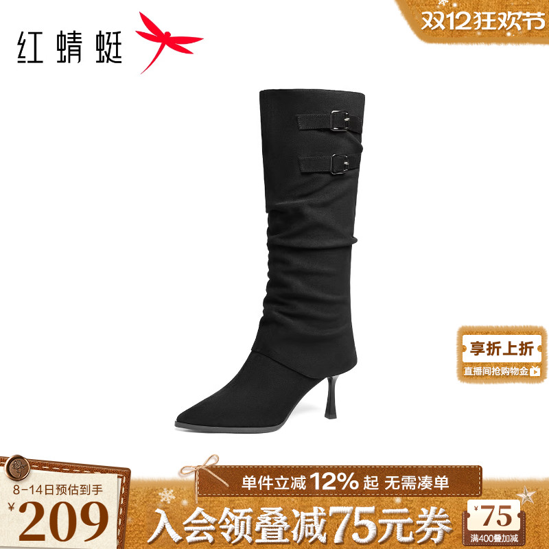 红蜻蜓长靴女2025冬季新款女靴高筒靴加绒尖头长筒靴弹力高跟靴子