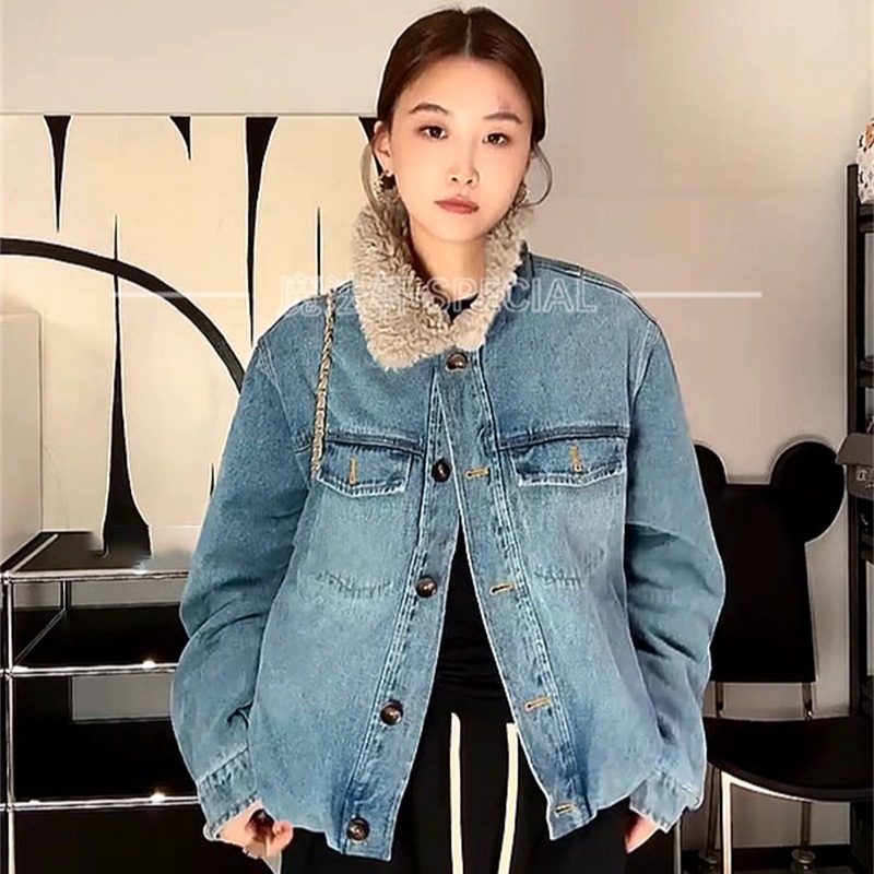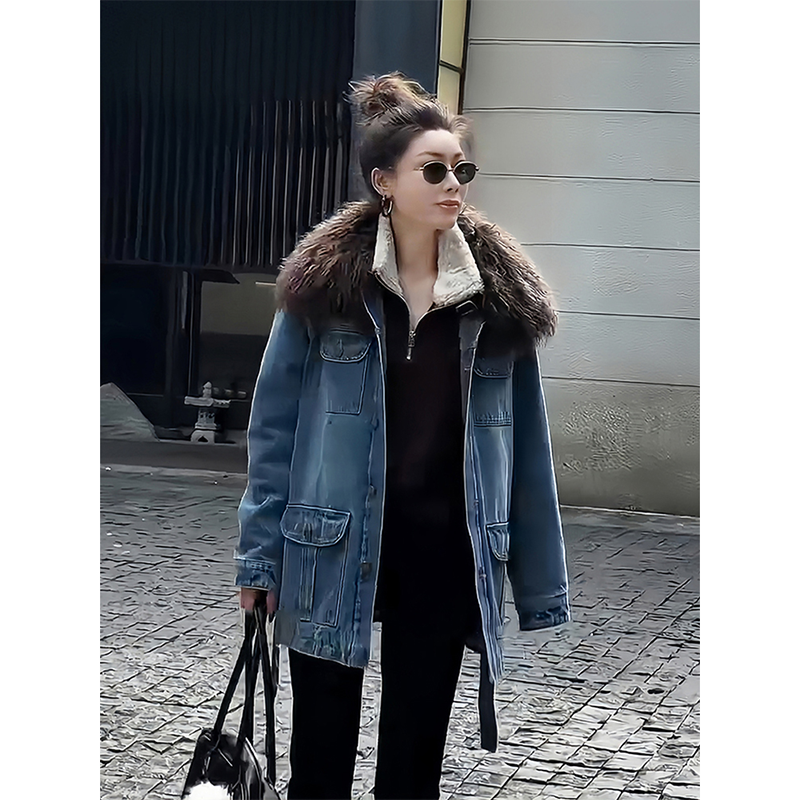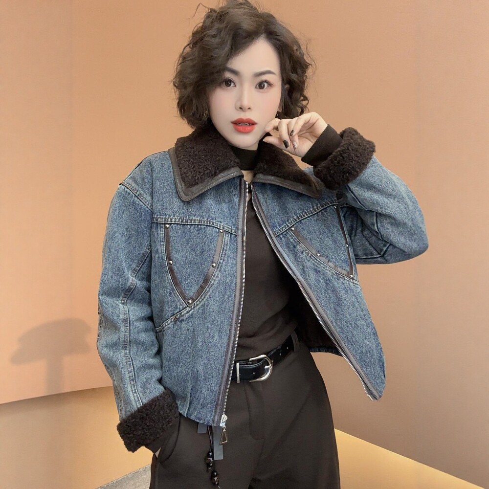 可可欢姐 秋冬羊羔毛翻领内里加棉工装口袋牛仔加厚棉衣服外套女