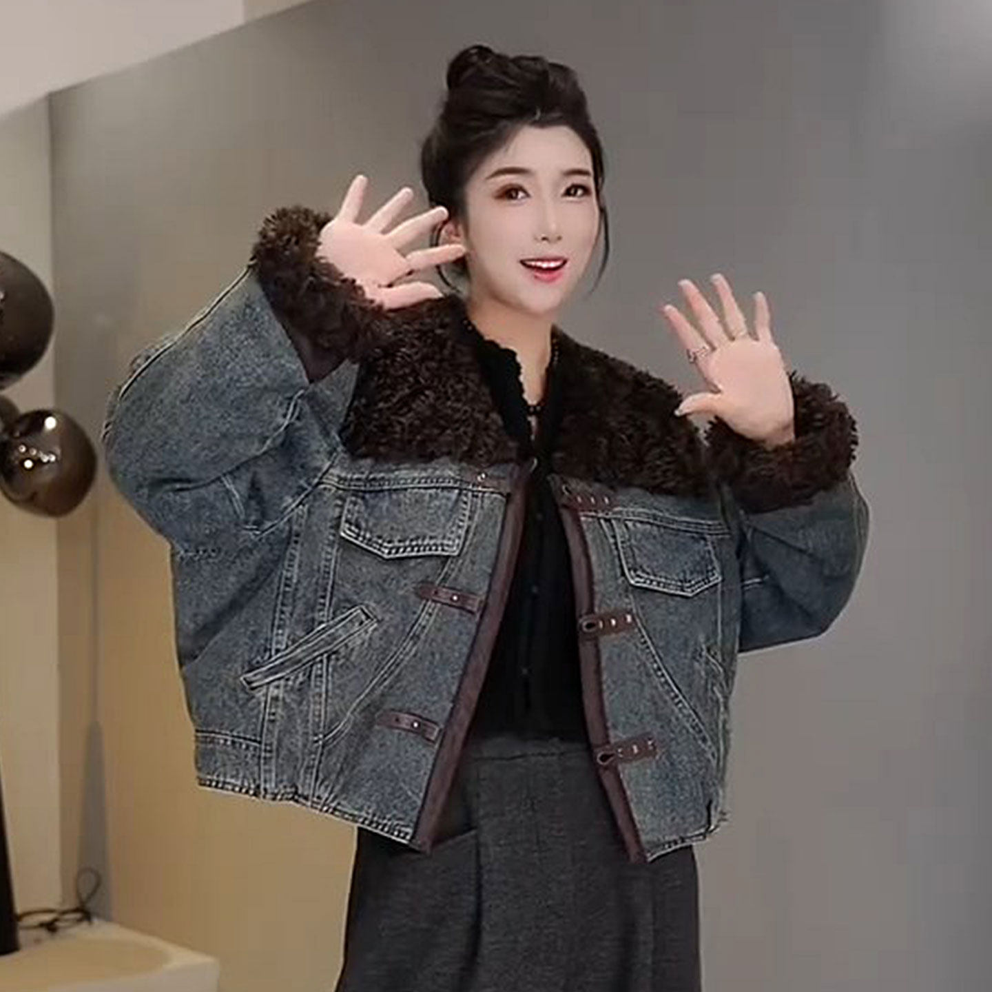 2025冬装新款复古拼接毛毛加棉牛仔外套女冬季时尚短款显瘦棉衣潮
