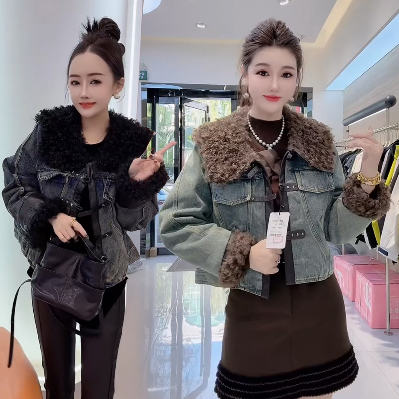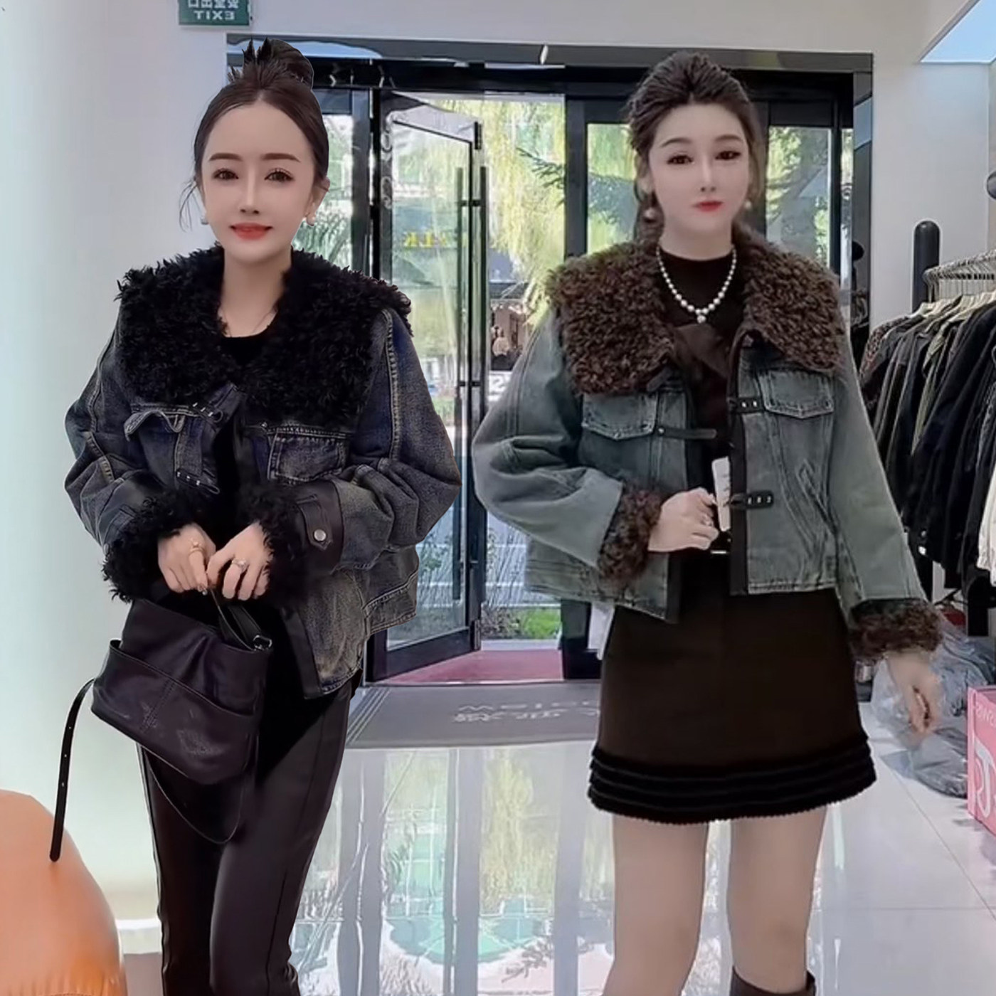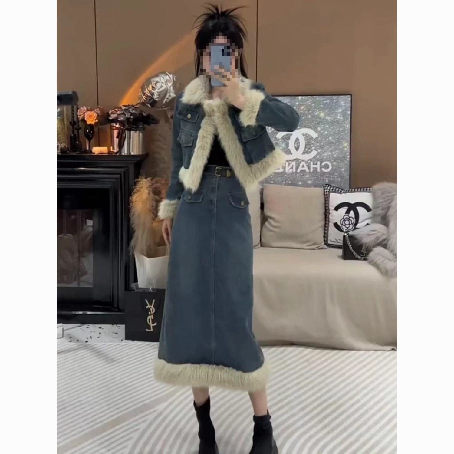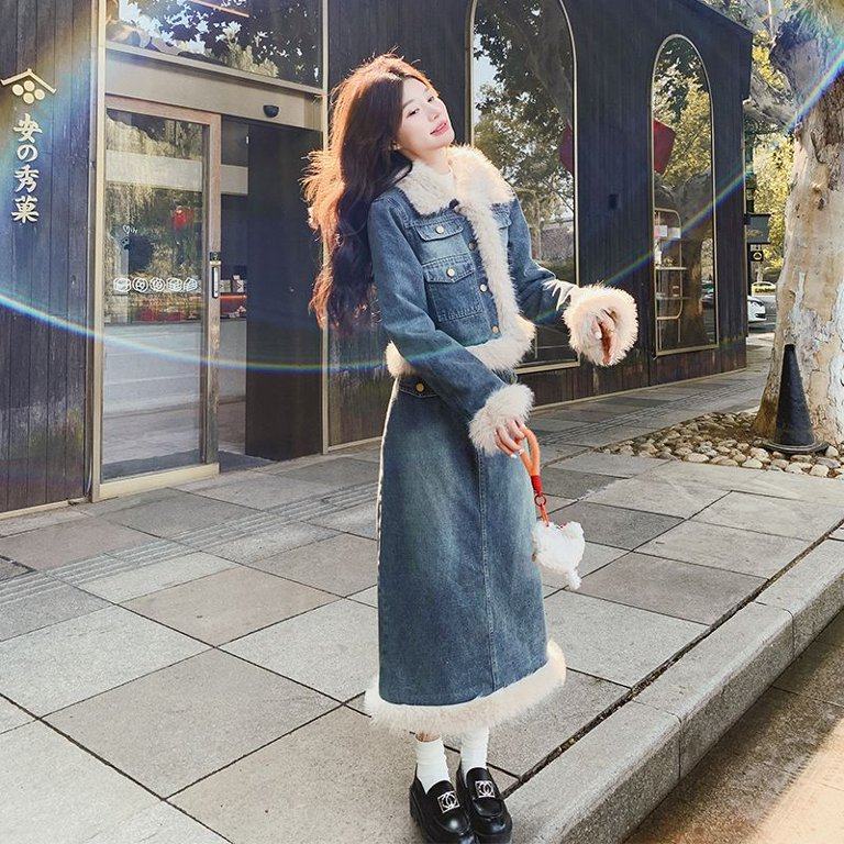 高级感轻奢风加厚加棉牛仔外套毛毛棉服半身裙套装气质复古两件套