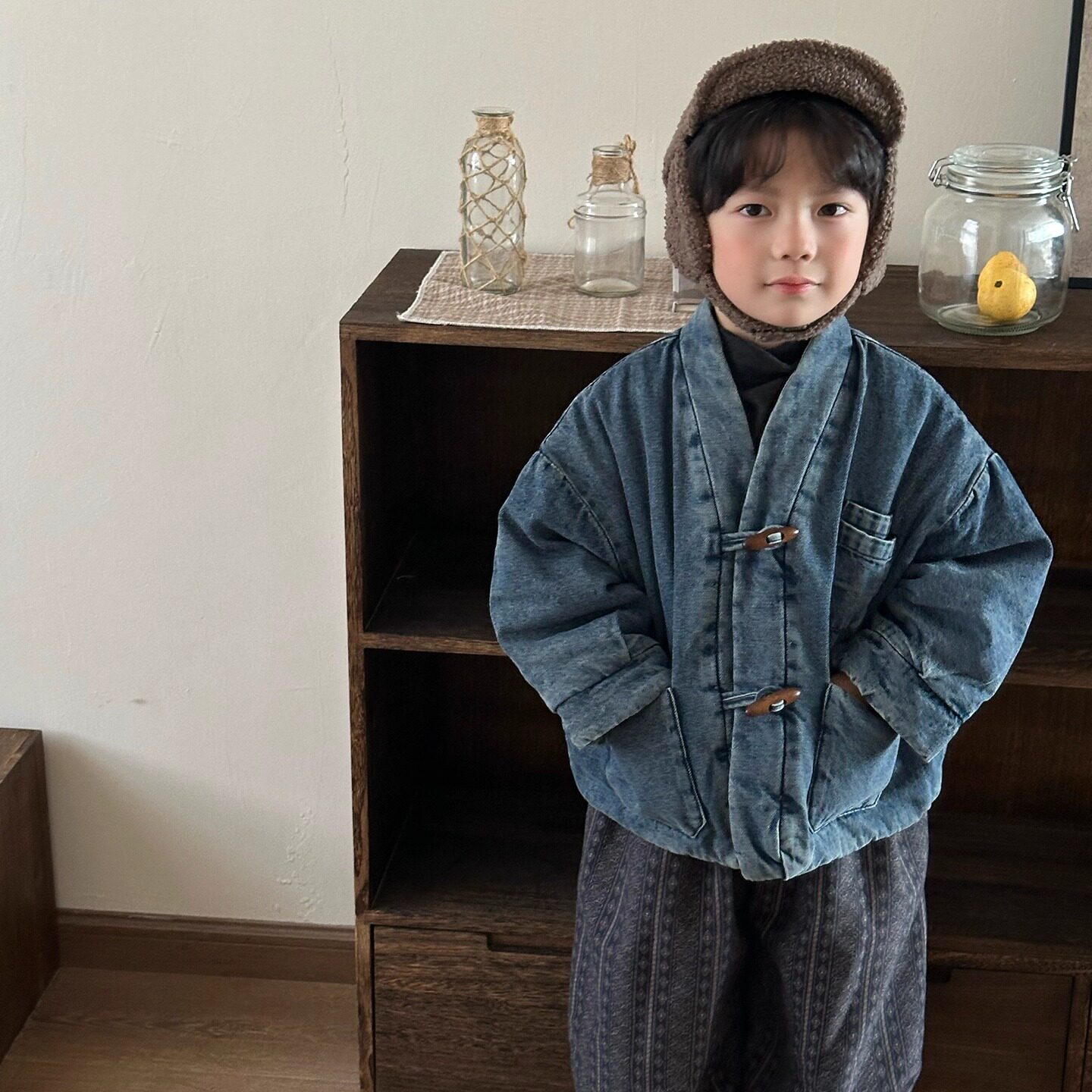 暮晨家新款冬装2025男童加棉牛仔外套夹克中小童加厚牛角扣棉袄