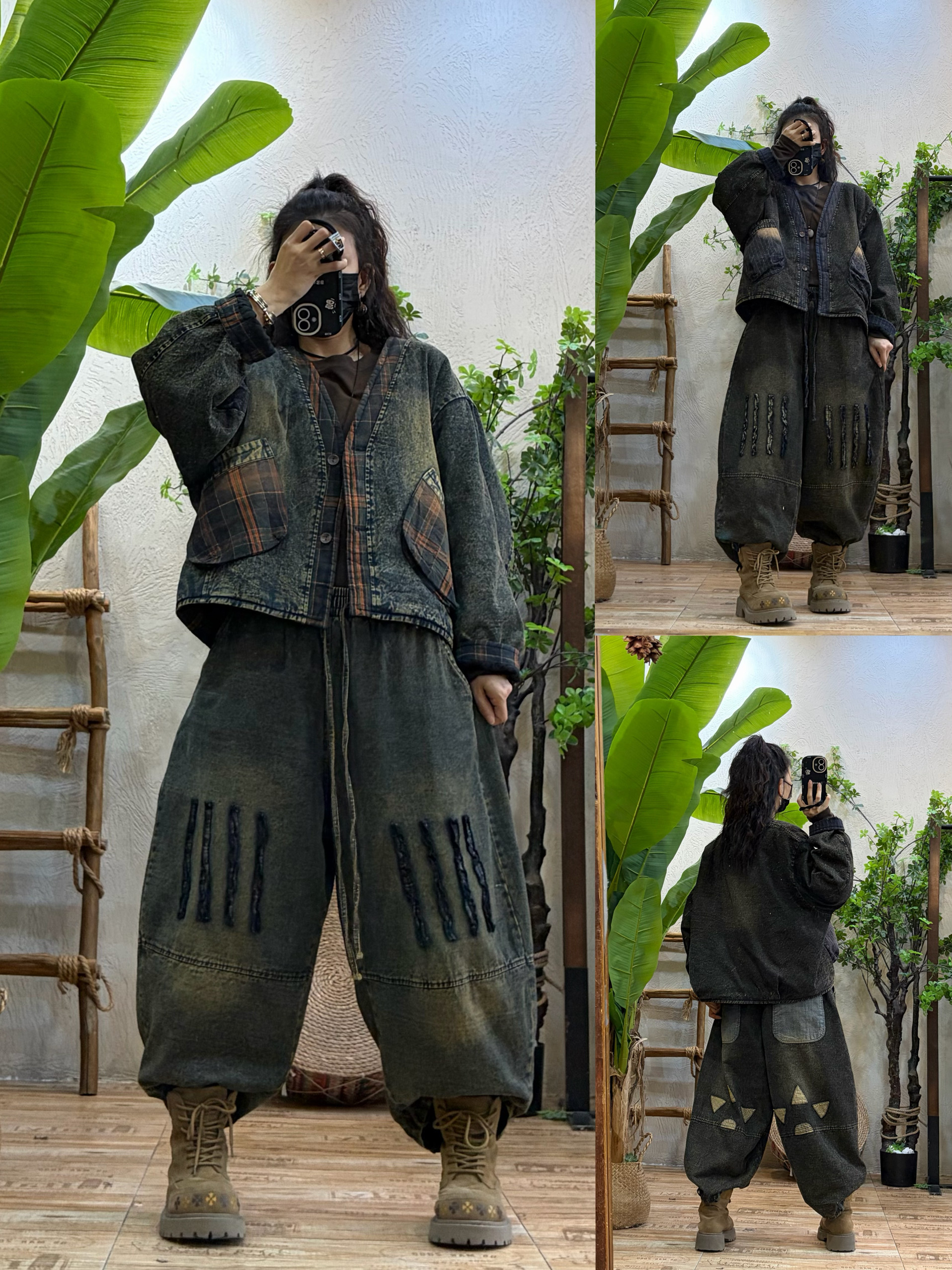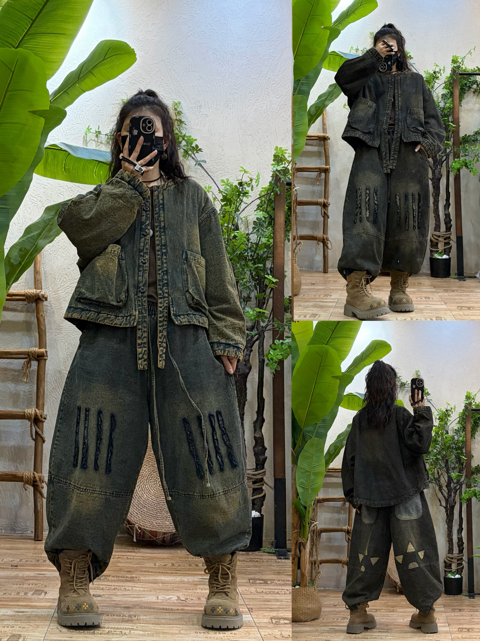 原创复古做旧加棉牛仔外套+哈伦裤两件套女 冬季新款宽松个性套装