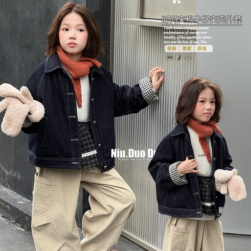 牛哆哆童装2025冬新款男女儿童韩版潮款格子袖加棉牛仔外套82273