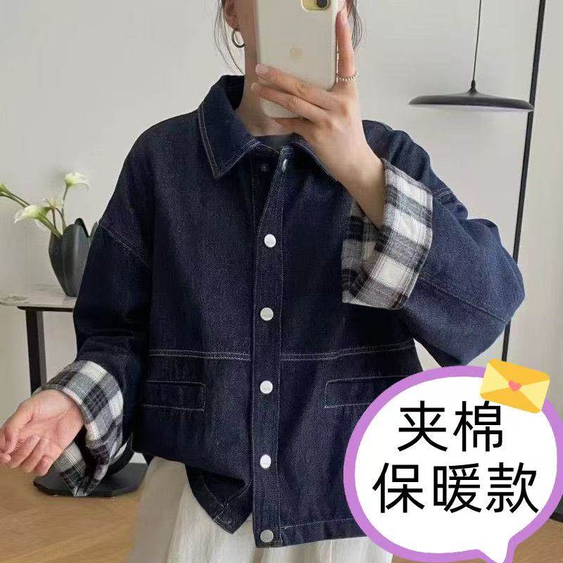 2025冬季韩版翻领洋气明线设计感袖口拼接格子牛仔棉服加棉外套女